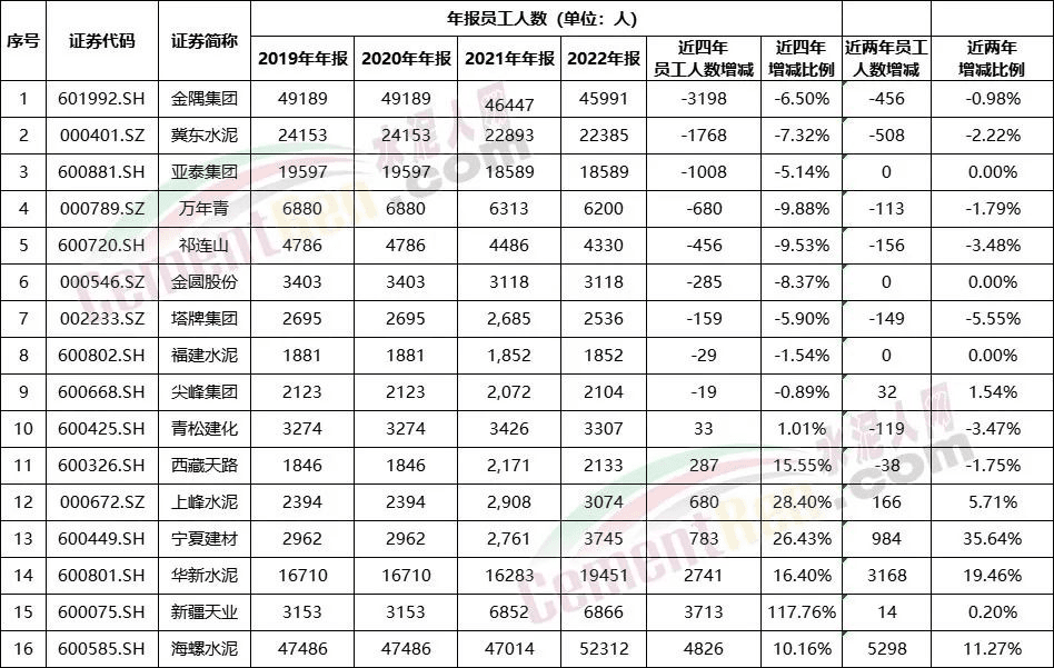 2021~2022年金隅集團(tuán)、冀東水泥、萬年青、祁連山、塔牌集團(tuán)、青松建化等均有百人以上的減員,冀東水泥減員達(dá)500多人 。