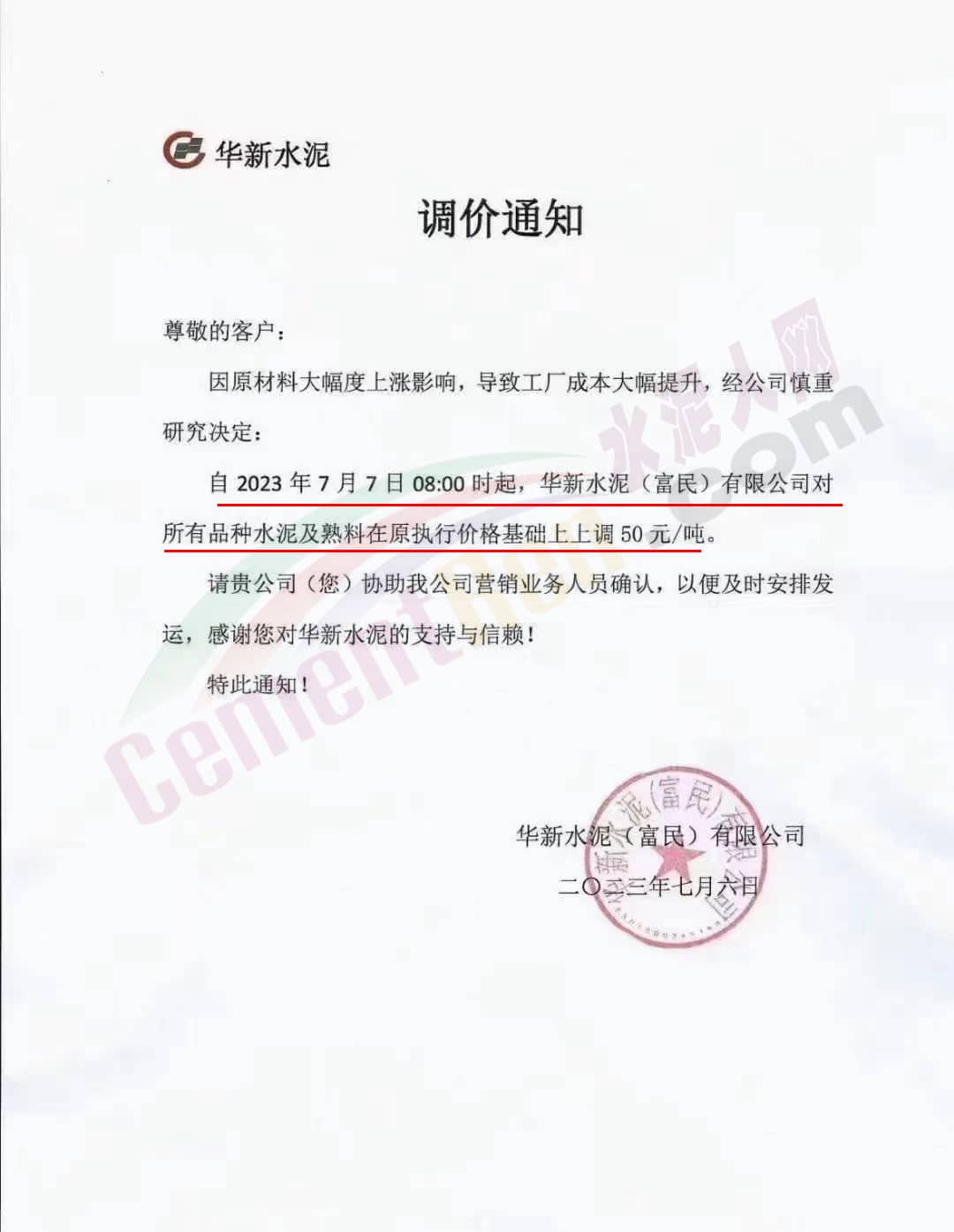 華新水泥(富民)有限公司通知,因原材料大幅度上漲影響,導致工廠成本大幅提升,經公司慎重研究決定:自2023年7月7日8時起,華新水泥(富民)有限公司對所有品種水泥及熟料在原執行價格基礎上上調50元/噸。