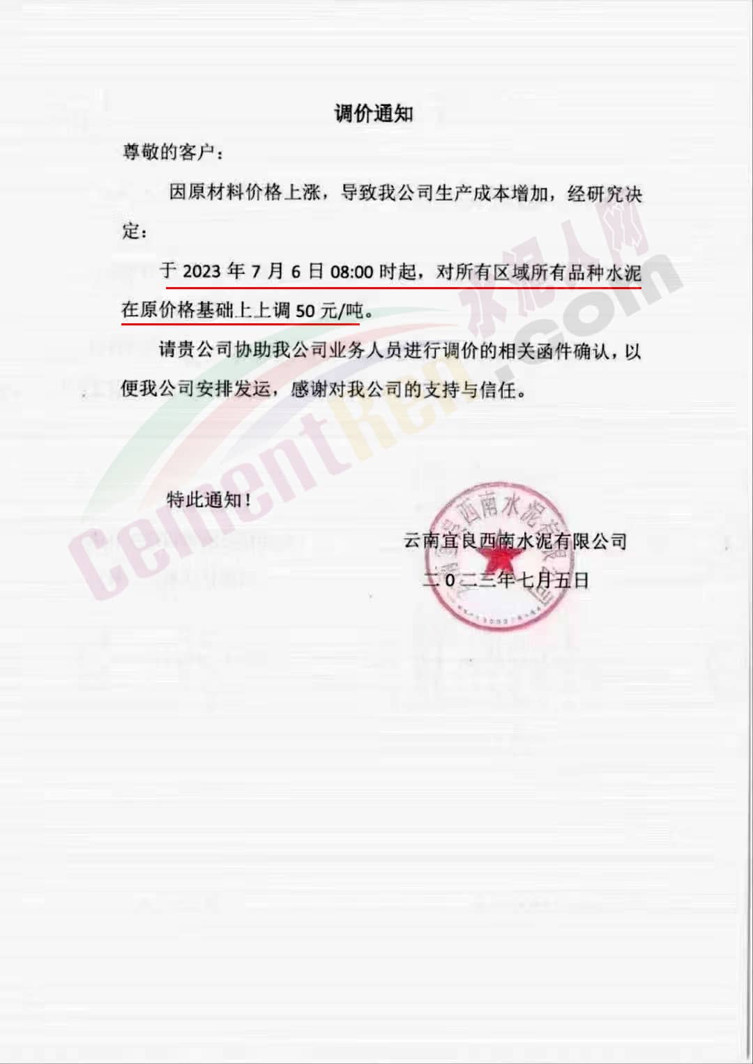 云南宜良西南水泥有限公司通知,因原材料價格上漲,導致公司生產成本增加,經研究決定:于2023年7月6日8時起,對所有區域所有品種水泥在原價格基礎上上調50元/噸。