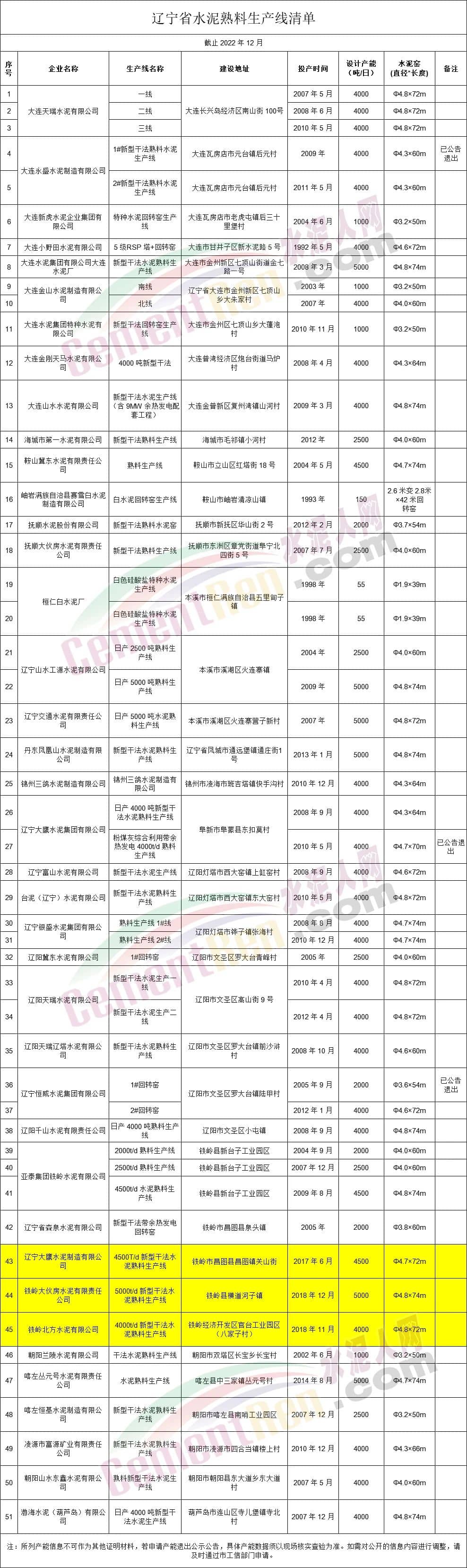 遼寧省水泥熟料生產線清單