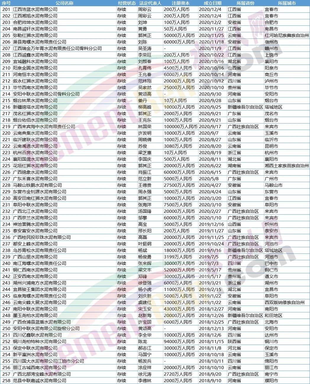 水泥人網注意到新成立企業中包含近年來新增產能較大的廣西區域,新成立企業包含知名企業廣西來賓海中水泥有限責任公司、廣西錦象水泥有限公司、廣西北江水泥有限公司、廣西京蘭水泥有限公司、都安上峰水泥有限公司等13家水泥公司。