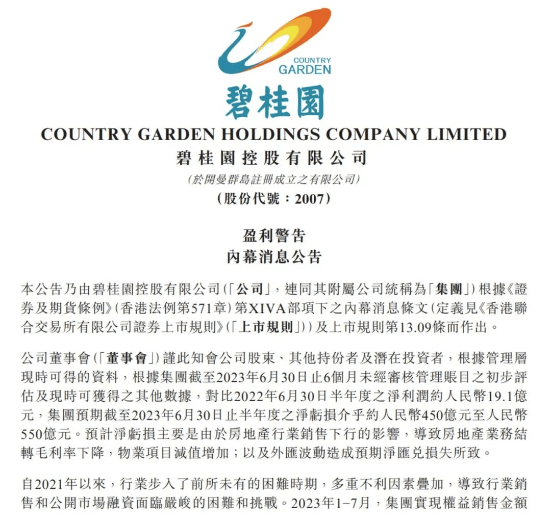 8月10日,處于輿論風(fēng)口浪尖的碧桂園以公告的方式正面回應(yīng)市場(chǎng)關(guān)切,坦承“公司遇到了自成立以來最大的困難”,公告中表示,預(yù)期截至2023年6月30日止半年度之凈虧損介乎約人民幣(下同)450億元-550億元。