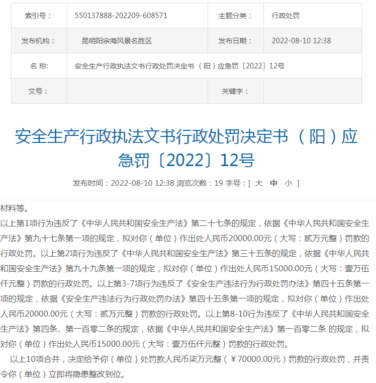 2022年8月10日,昆明陽宗海風(fēng)景名勝區(qū)管理委員會發(fā)布《安全生產(chǎn)行政執(zhí)法文書行政處罰決定書(陽)應(yīng)急罰〔2022〕12號》稱:昆明市明良匯江水泥制造有限公司大馬山石灰?guī)r礦在生產(chǎn)過程中存在未配備注冊安全工程師、采礦技術(shù)員,礦山+1980m水平臺階存在凹陷,該區(qū)域未設(shè)置警示標(biāo)識,礦山未編制挖掘機(jī)、裝載機(jī)、推土機(jī)操作規(guī)程等違法違規(guī)行為,昆明陽宗海風(fēng)景名勝區(qū)管理委員會對該水泥廠作出7萬元處罰。