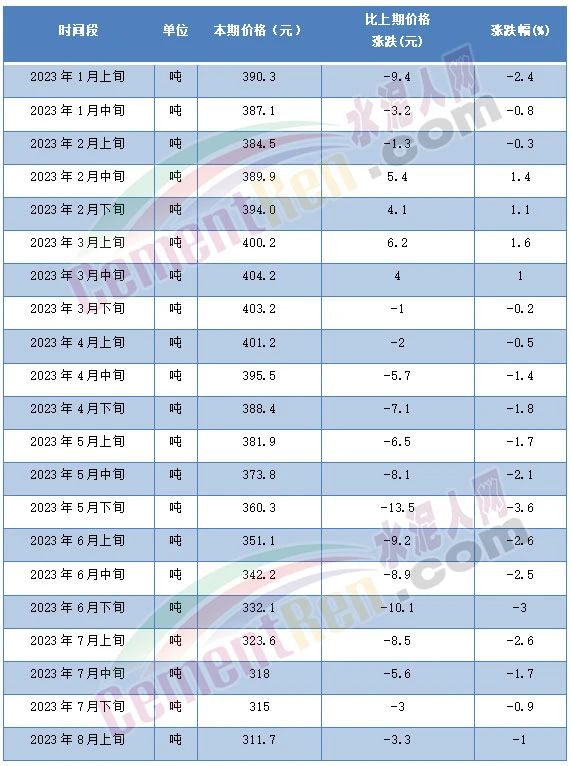 8月14日,國家統(tǒng)計(jì)局發(fā)布的2023年8月上旬流通領(lǐng)域重要生產(chǎn)資料市場價(jià)格變動(dòng)情況顯示,普通硅酸鹽水泥(P.O42.5散裝)水泥報(bào)價(jià)311.7元/噸,且為自5月上旬以來第10次突破年內(nèi)最低價(jià)。