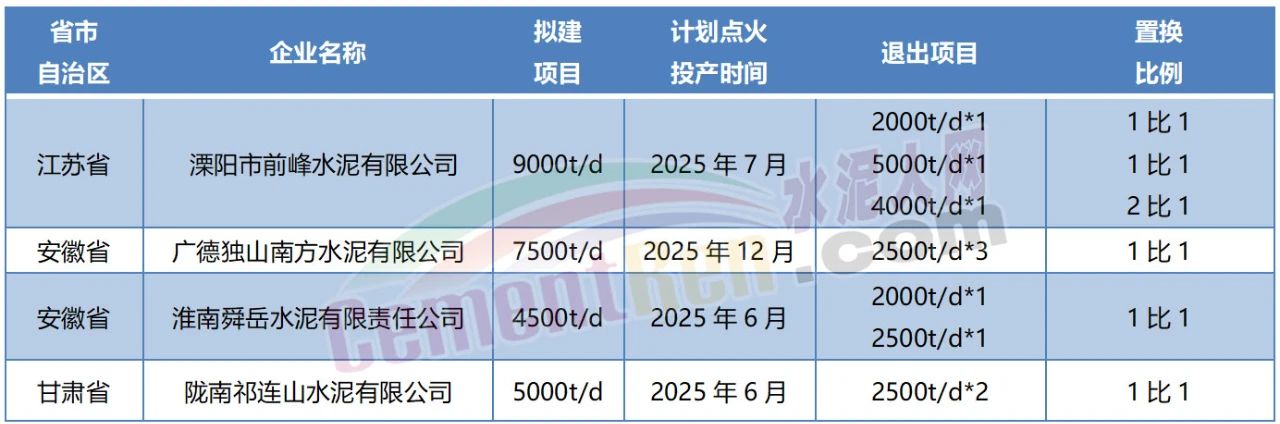 江蘇工信廳2023年7月25日公告,溧陽市前峰水泥有限公司擬建一條9000t/d水泥熟料生產線,退出項目分別為江蘇金峰水泥集團有限公司1條2000t/d、江蘇溧陽南方水泥有限公司1條5000t/d,置換退出比例為1:1。江南-小野田水泥有限公司1條4000t/d熟料生產線,置換比例為2:1。