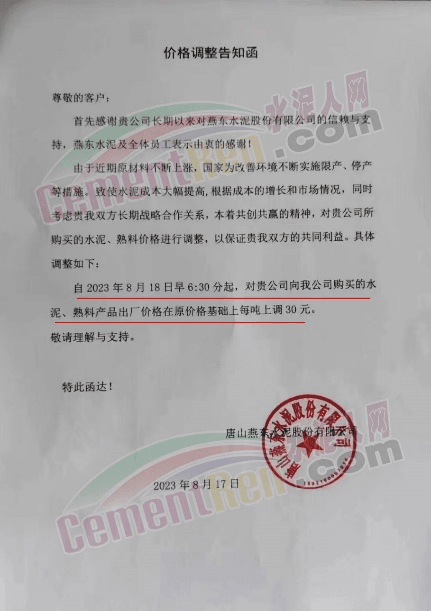 唐山燕東水泥有限公司通知稱,由于近期原材料不斷上漲,國家為改善環境不斷實施限產、停產等措施。致使水泥成本大幅提高,根據成本的增長和市場情況,自2023年8月18日早6:30分起,對水泥、熟料產品出廠價格在原價格基礎上每噸上調30元。
