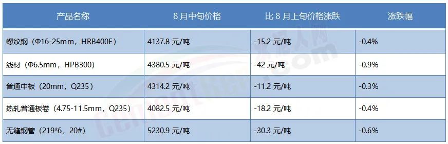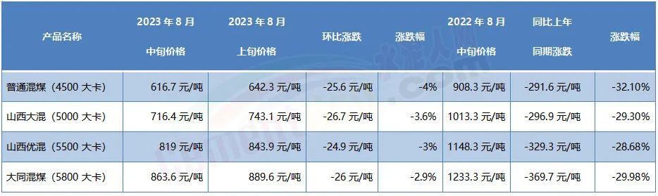 煤價方面,8月中旬各熱值煤炭價格同比上年同期,出現了近三成的下跌,全部跌至900元/噸以下。