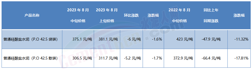 水泥價格方面,8月中旬流通領域P.O42.5散裝水泥報價306.5元/噸,較8月上旬下跌了5.2元/噸,跌幅1.7%。同比2022年8月上旬流通領域P.O42.5散裝水泥報價372.9元/噸,下跌了66.4元/噸,跌幅17.81%。