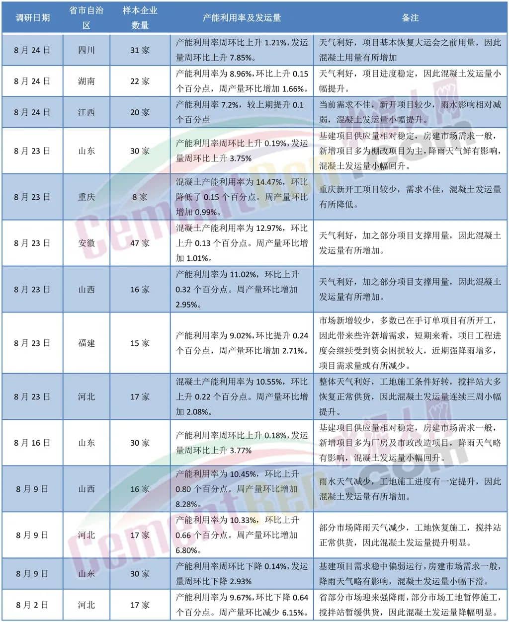 一業內人士表示,水泥價格下跌30元/噸,混凝土成本減少10元/方。混凝土報價的持續下跌,也反映了水泥市場競爭的激烈。同樣也預示著商混市場的“價格戰”也正在激化中。從近期各區域商混企業的產能利用率也可見一斑。