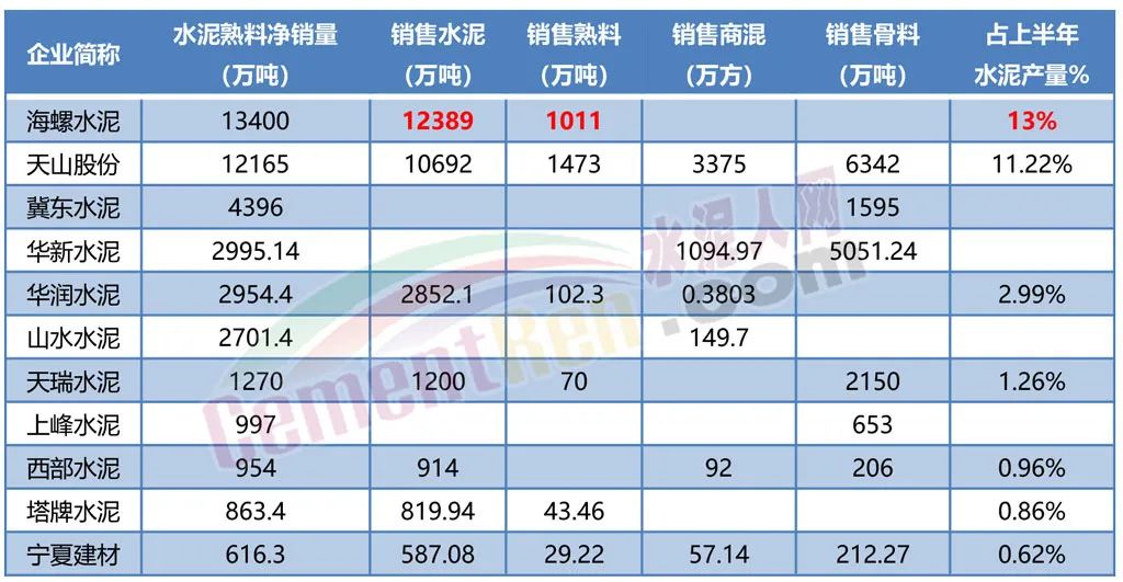 海螺水泥近期表示,去年下半年之后海螺的份額有所回升,基本維持在13%左右。而從近期公布財報的12家上市企業產品銷量數據可見,僅產能排名前兩位的海螺水泥和天山股份水泥和熟料合計銷量過億噸。排名銷量第三位的冀東水泥銷售僅是海螺水泥的三分之一。其中,天山股份水泥銷量10692萬噸,占比11.22%;按照海螺水泥公布的上半年市場份額維持在13%左右推算,其水泥銷量或達12389萬噸,熟料銷量達1011萬噸。