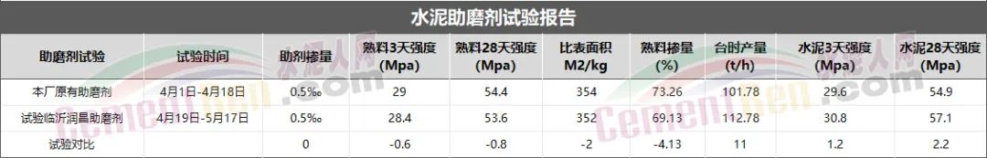 山東棗莊某水泥廠(chǎng)于4月1日—4月18日先試驗(yàn)原有助磨劑,以其生產(chǎn)時(shí)間段為基數(shù),4月19日—5月17日時(shí)間段開(kāi)始試驗(yàn)應(yīng)用潤(rùn)昌科技助磨劑,將兩段時(shí)間段進(jìn)行對(duì)比。試驗(yàn)結(jié)果如下所示: