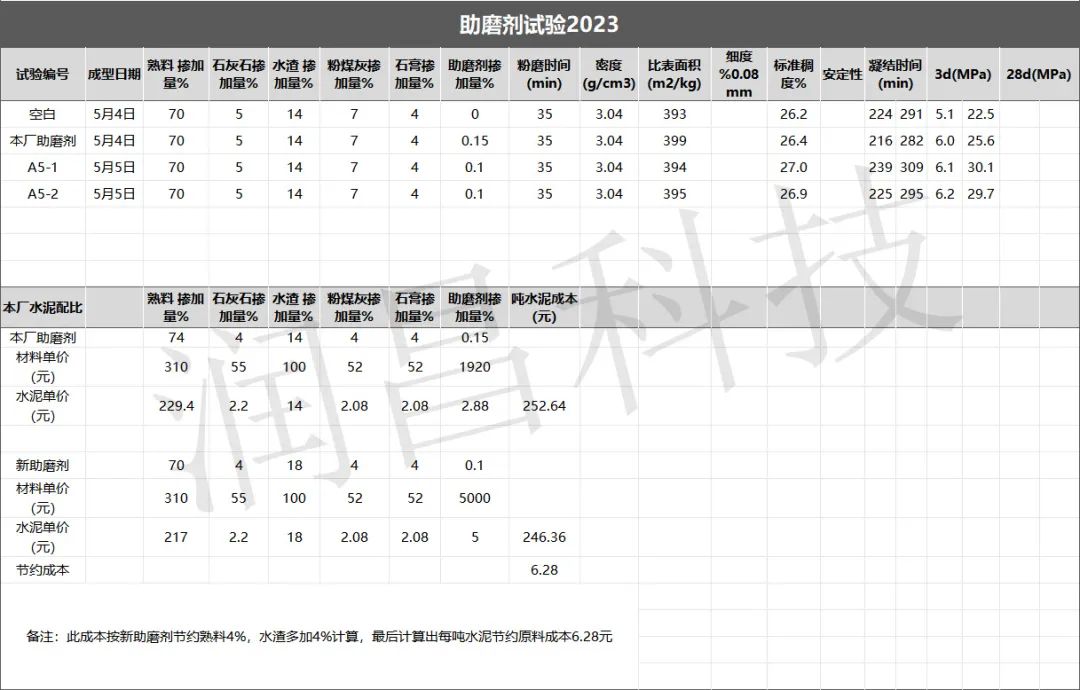 對(duì)比該水泥廠(chǎng)原先使用的助磨劑,使用潤(rùn)昌科技A5-1、A5-2新型助磨劑水泥三天強(qiáng)度分別增加4.5MPa,4.1MPa,熟料摻量減少4%,混合材摻量增加4%,綜合計(jì)算下來(lái)每噸水泥節(jié)約原料成本6.28元。
