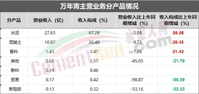 今年上半年,萬年青所有產品業務版塊營業收入同比去年均有所減少,但水泥、混凝土、骨料業務營業收入占比同比去年均有所增加。水泥營收占比同比增加39.36%,混凝土營收占比同比增加28.45%,骨料營收占比同比增加31.42%。