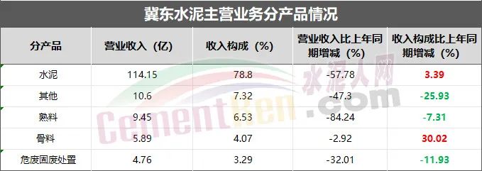 今年上半年,冀東水泥各產品業務營業收入同比去年均有所減少,但水泥和骨料營收收入占比同比去年有所增加,其中,骨料營收收入占比同比去年增加30.02%。據水泥人網了解,冀東水泥主要業務及產能公司及子公司的主要業務為硅酸鹽水泥、熟料及相關建材產品的制造和銷售,同時涵蓋砂石骨料、危固廢處置、外加劑等產業(業務)。