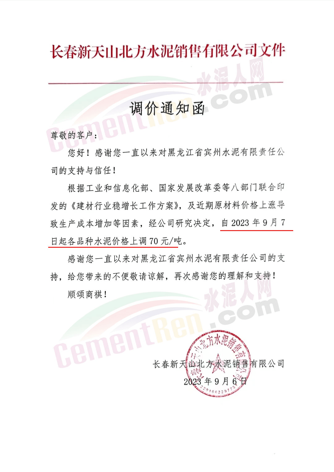 長(zhǎng)春新天山北方水泥銷(xiāo)售有限公司通知,根據(jù)工業(yè)和信息化部、國(guó)家發(fā)展改革委等八部門(mén)聯(lián)合印發(fā)的《建材行業(yè)穩(wěn)增長(zhǎng)工作方案》,及近期原材料價(jià)格上漲導(dǎo)致生產(chǎn)成本增加等因素,經(jīng)公司研究決定,自2023年9月7日起各品種水泥價(jià)格上調(diào)70元/噸。