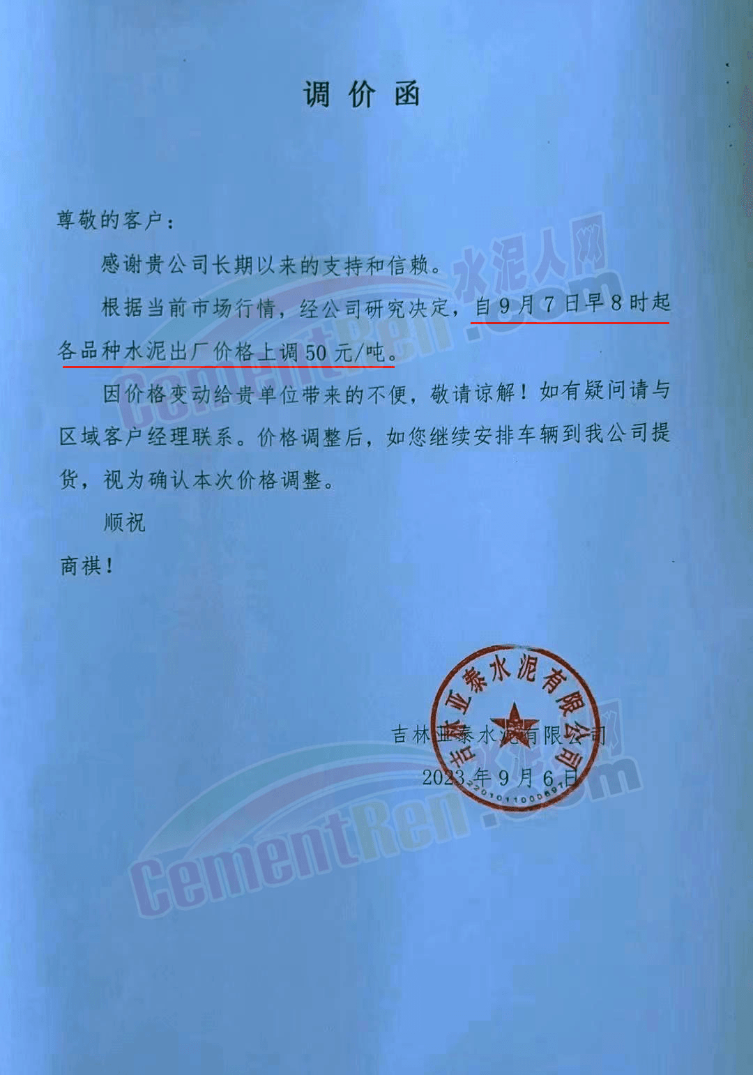 吉林亞泰水泥有限公司通知,根據(jù)當(dāng)前市場(chǎng)行情,經(jīng)公司研究決定,自9月7日早8時(shí)起各品種水泥出廠價(jià)格上調(diào)50元/噸。