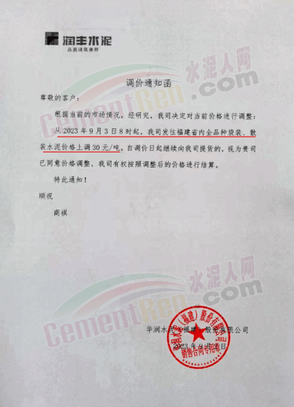 福建龍麟集團有限公司通知,根據目前市場行情及受原材料物流價格影響,經公司研究決定:自2023年9月3日0時起,公司發往福建省內各區域各規格型號散裝、袋裝水泥出廠價格在原價格基礎上上調30元/噸。