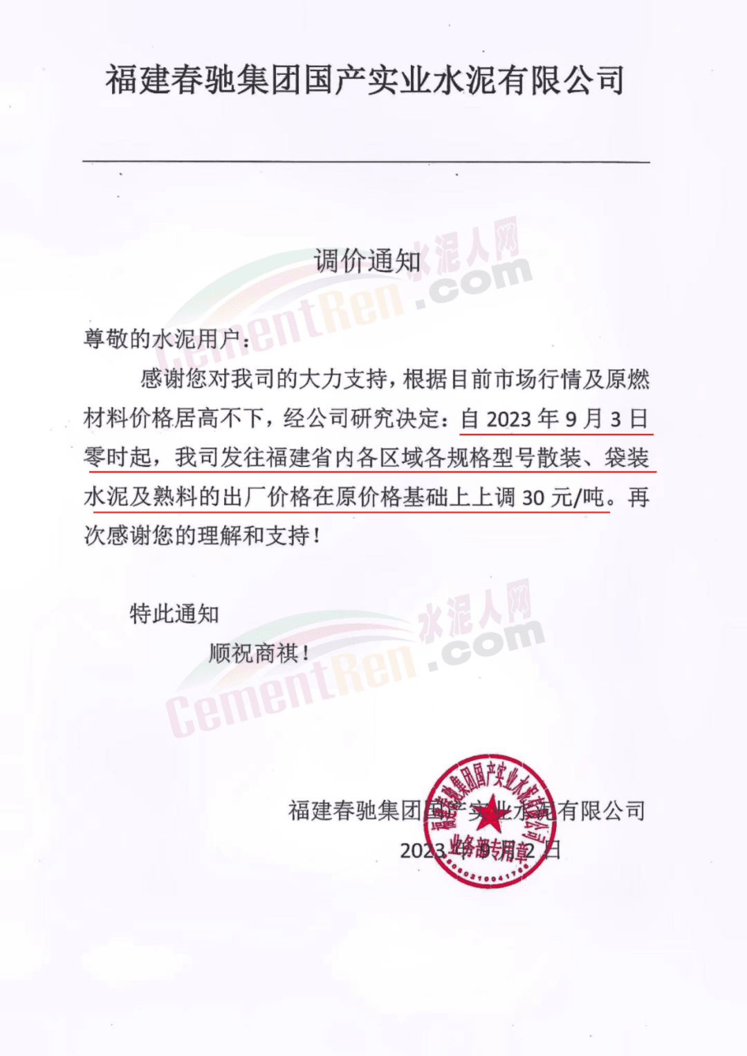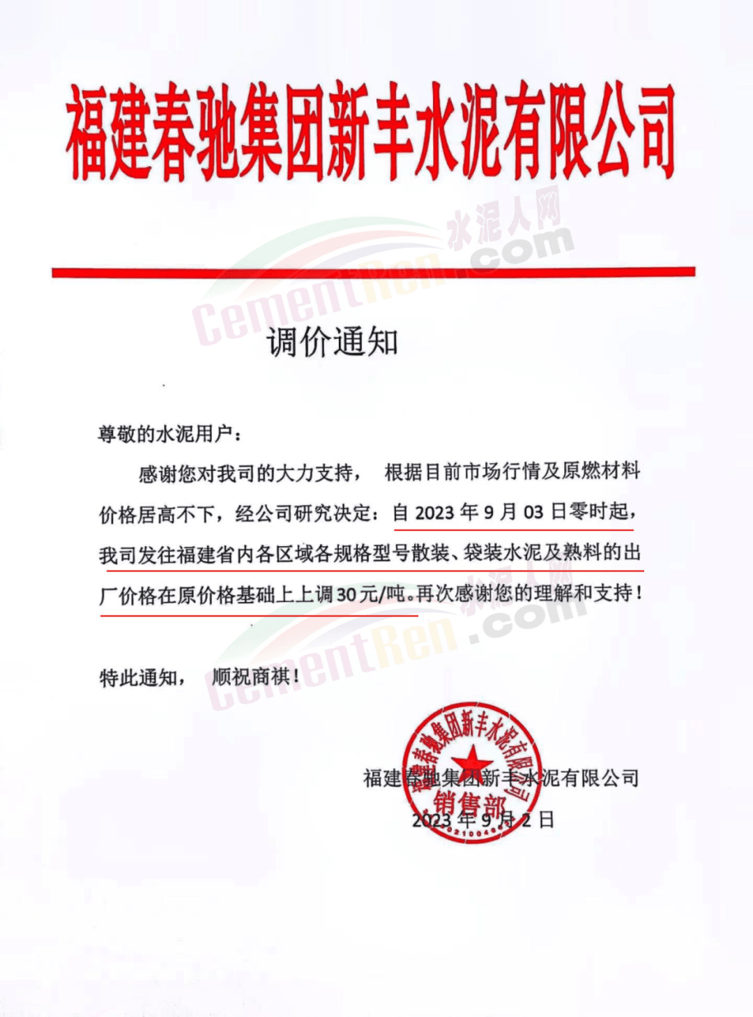 福建春馳集團國產實業水泥有限公司、福建春馳集團新豐水泥有限公司通知,根據目前市場行情及原燃材料感謝您對公司的大力支持,價格居高不下,經公司研究決定:自2023年9月3日零時起公司發往福建省內各區域各規格型號散裝、袋裝水泥及熟料的出廠價格在原價格基礎上上調30元/噸。