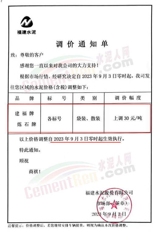 福建水泥股份有限公司通知,根據市場行情,經研究決定自2023年9月3日0時起,公司“建福牌、煉石牌”發往各區域的水泥含稅價格上調30元/噸。