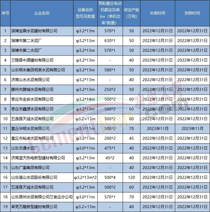 據水泥人網不完全統計,今年1-7月,山東省公告用于置換或補齊產能退出的粉磨生產線共20條,關停拆除時間多在2022年12月31日。