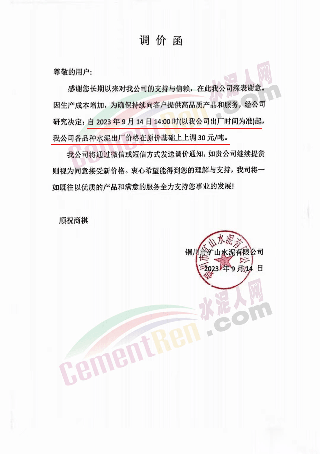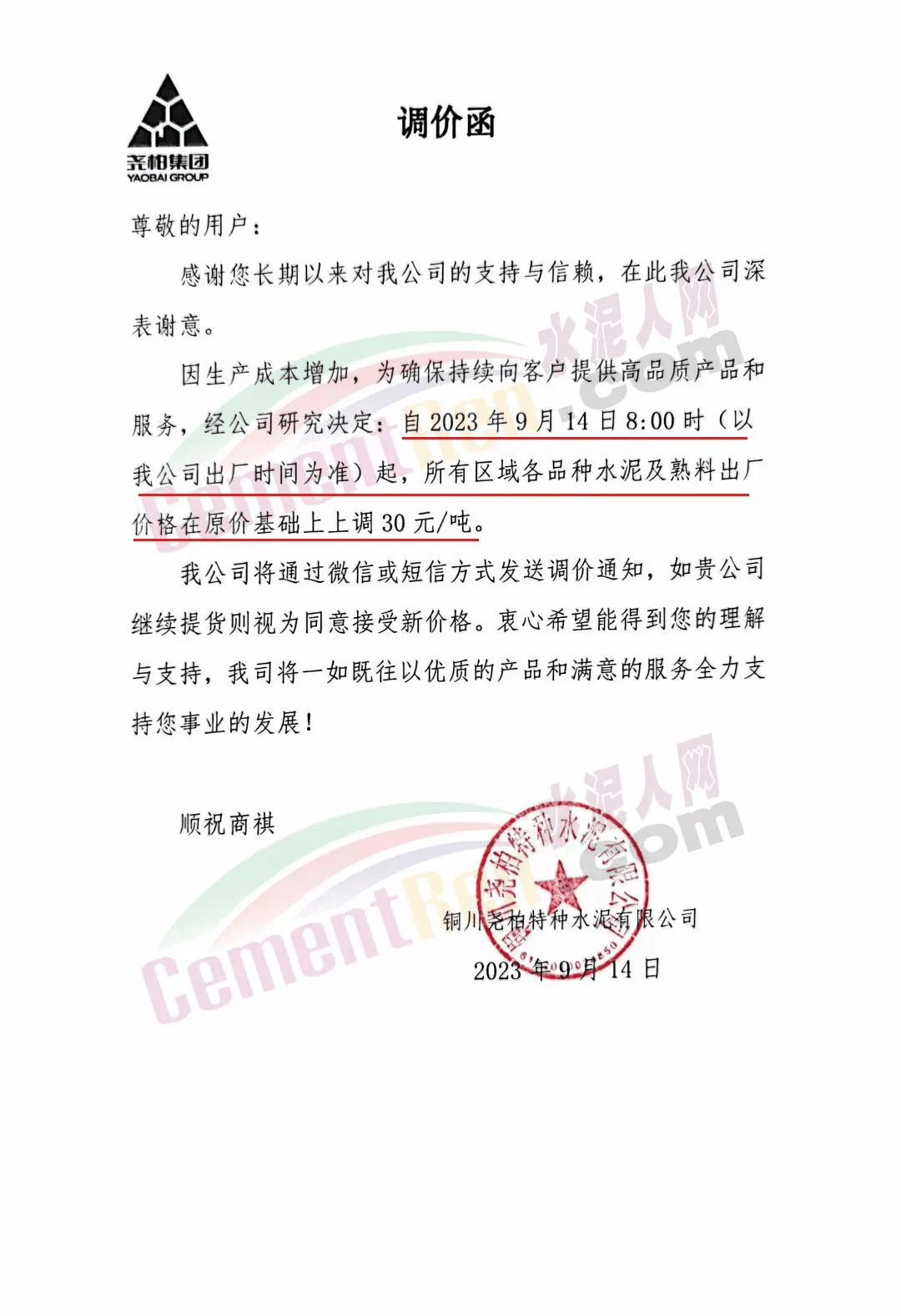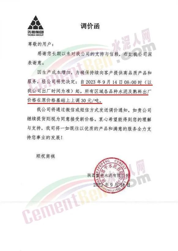 華新金龍水泥(鄖縣)有限公司通知,鑒于當(dāng)前原材料價(jià)格上漲,及市場(chǎng)行情變化,公司決定于2023年9月14日起所有品種水泥價(jià)格上調(diào)30元/噸。