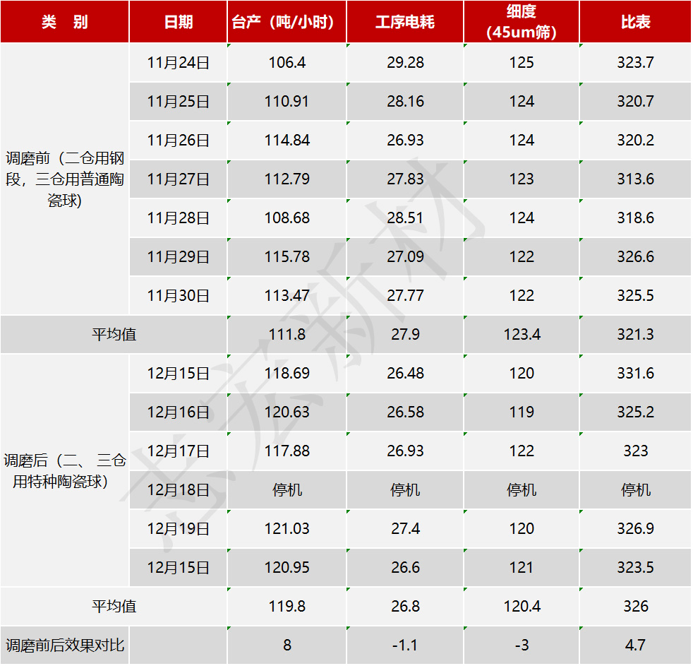 2#水泥磨粉磨工序調磨前后統計數據及對比
