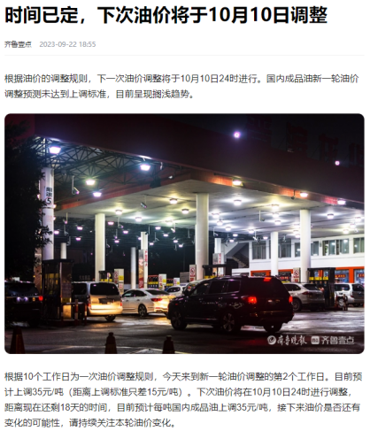 近來有消息稱,下一輪油價將于10月10日進行調(diào)整。根據(jù)10個工作日為一次油價調(diào)整規(guī)則,目前預計上調(diào)35元/噸(距離上調(diào)標準只差15元/噸)。下次油價將在10月10日24時進行調(diào)整。距離現(xiàn)在還剩10幾天的時間,目前預計每噸國內(nèi)成品油上調(diào)35元/噸。