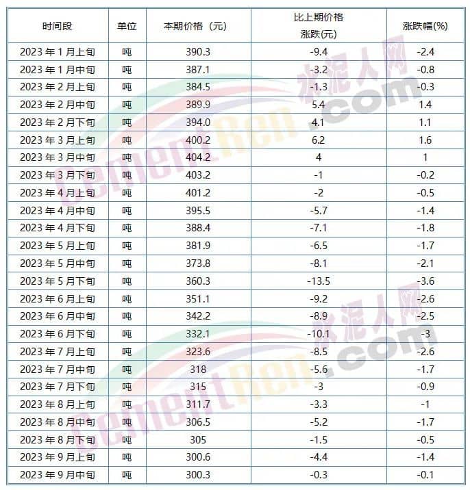 從近期國家統(tǒng)計局公布的數(shù)據(jù)可見,流通領(lǐng)域水泥價格連續(xù)下跌已放緩。流通區(qū)域普通硅酸鹽水泥(P.O42.5散裝)9月中旬報價300.3元/噸,為年內(nèi)最低價。且從3月下旬開始連續(xù)18期下跌,從5月上旬開始連續(xù)14期創(chuàng)年內(nèi)低點。較本年高點404.2元/噸,相差103.9元/噸。可喜的是近期跌幅收窄至0.1%,為年內(nèi)最低跌幅,這也意味著即將回升的趨勢。