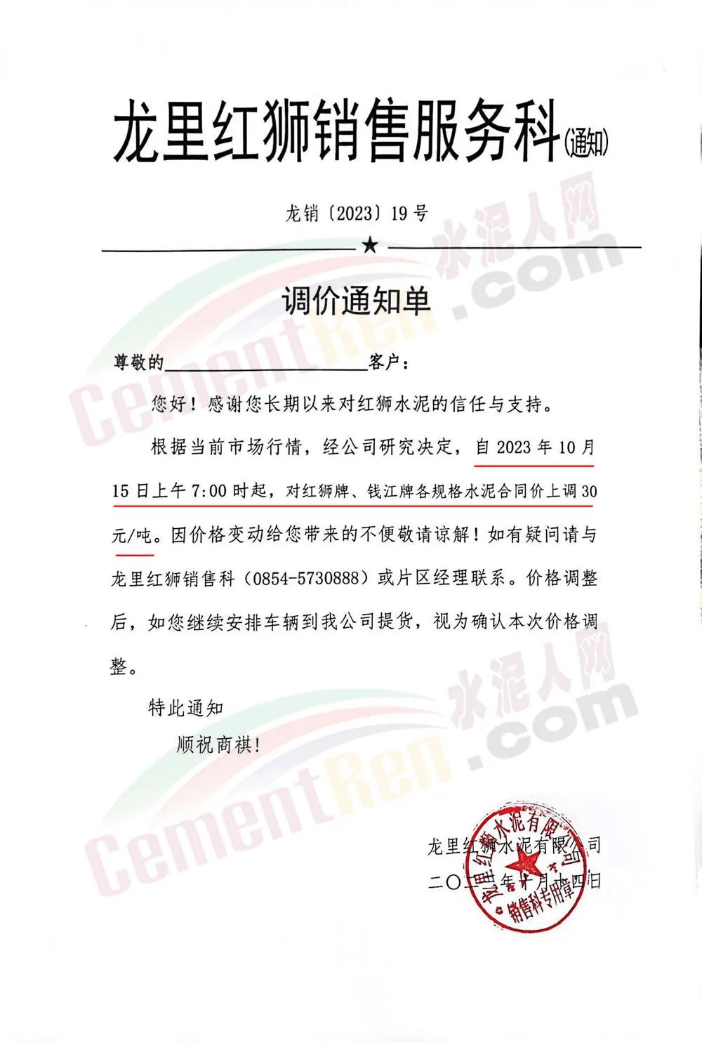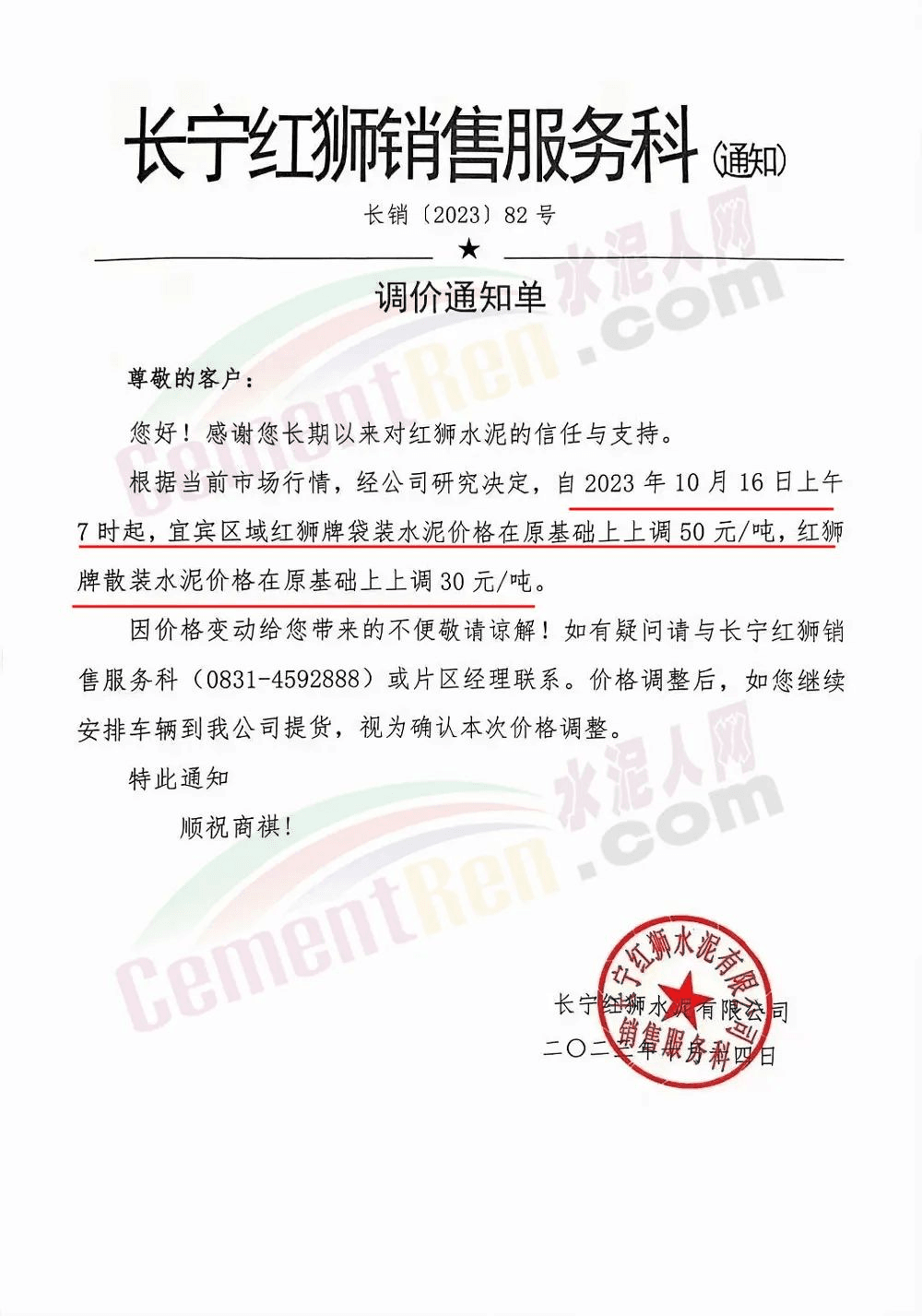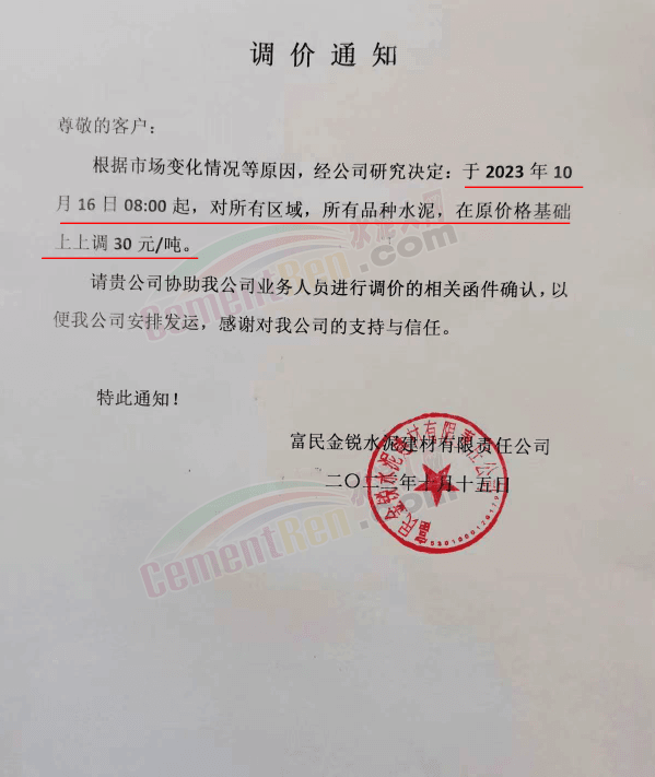 富民金銳水泥建材有限責(zé)任公司通知,根據(jù)市場(chǎng)變化情況等原因,經(jīng)公司研究決定,于2023年10月16日8時(shí)起,對(duì)所有區(qū)域,所有品種水泥,在原價(jià)格基礎(chǔ)上上調(diào)30元/噸。