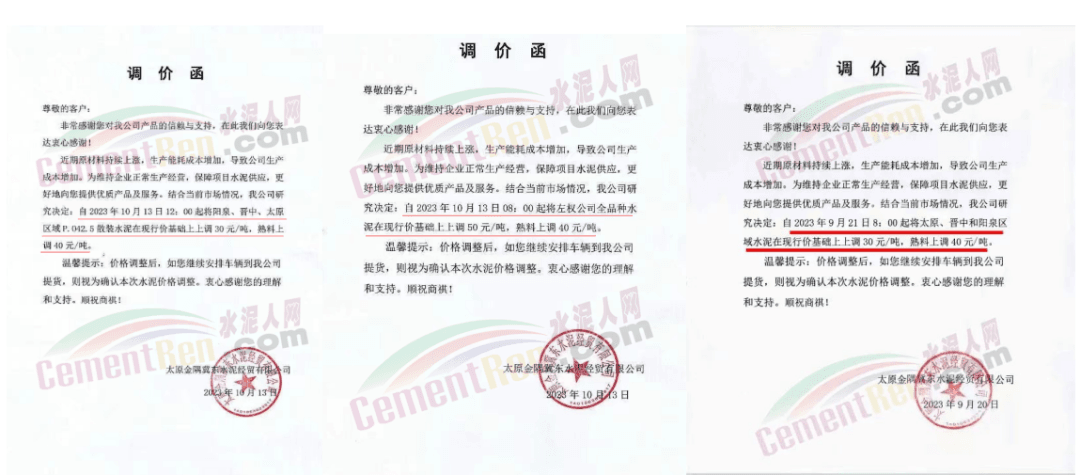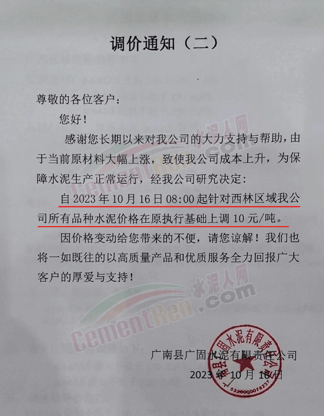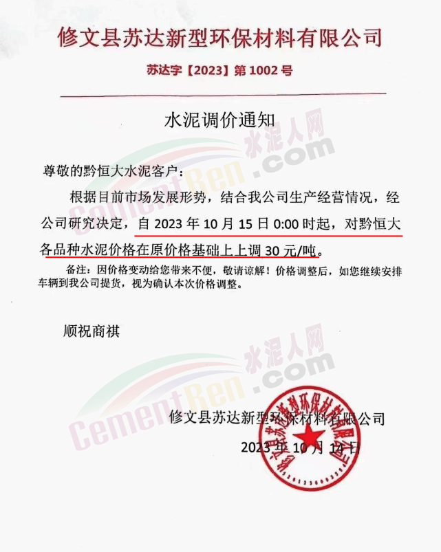 畢節(jié)賽德水泥有限公司通知,由于原材料價(jià)格持續(xù)上漲,導(dǎo)致公司生產(chǎn)成本增加,經(jīng)公司研究決定,自2023年10月16日零點(diǎn)起,對(duì)所有區(qū)域各品種水泥出廠價(jià)格在原有價(jià)格基礎(chǔ)上上調(diào)30元/噸。