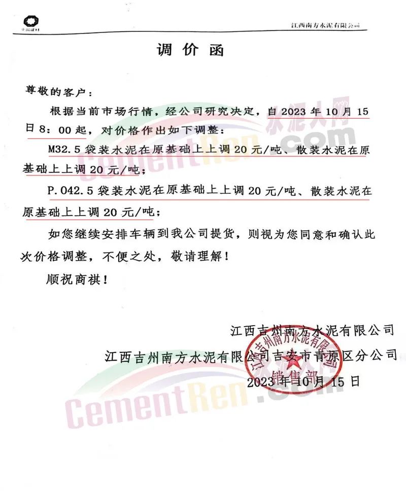 江西日江水泥制造有限公司通知,根據(jù)市場(chǎng)情況,經(jīng)研究決定自2023年10月15日上午9時(shí)起各標(biāo)號(hào)水泥價(jià)格上調(diào)20元/噸。