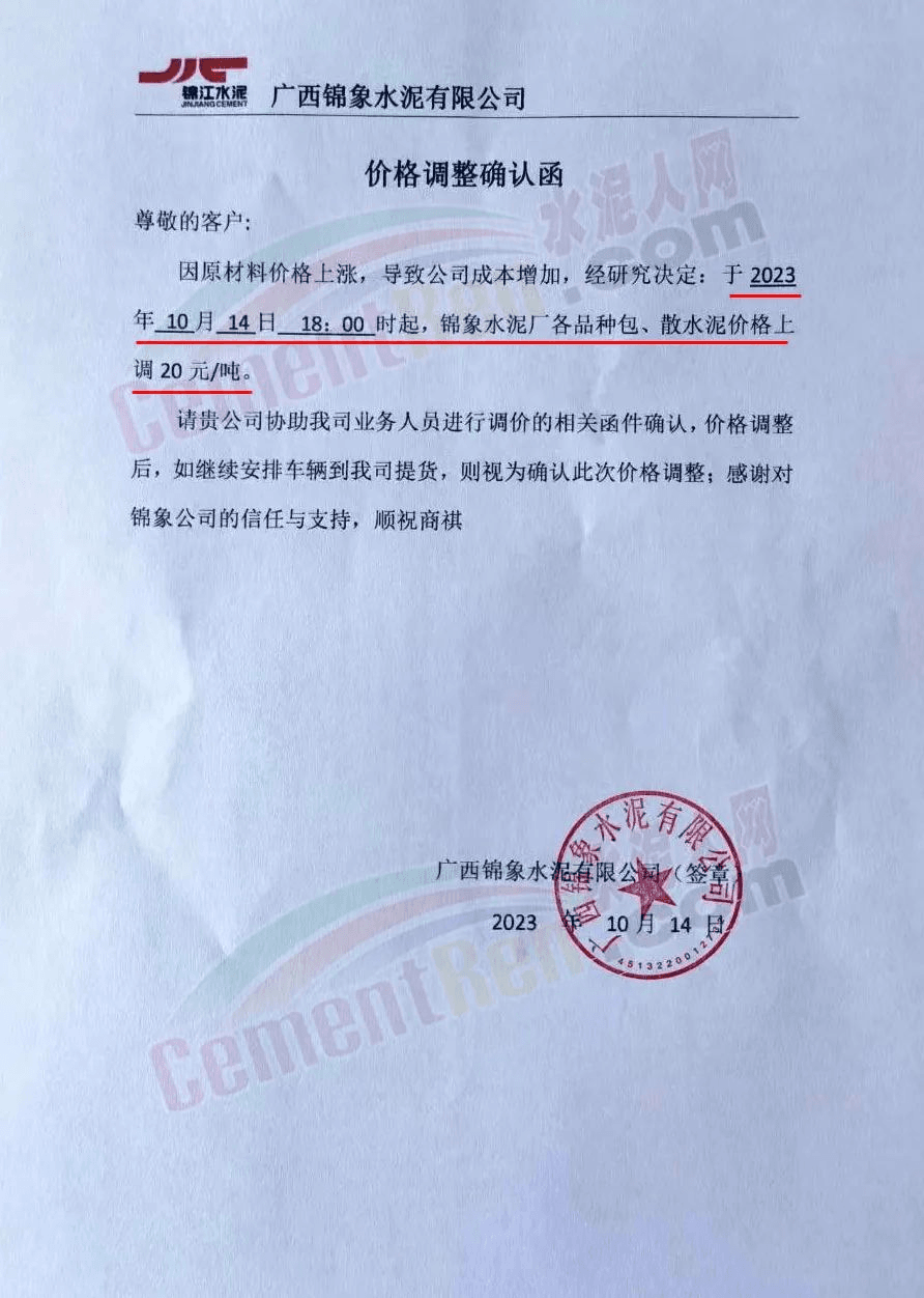 廣西新建線企業(yè)錦象水泥通知,因原材料價(jià)格上漲,導(dǎo)致公司成本增加,經(jīng)研究決定,于2023年10月14日起,各品種包、散水泥價(jià)格上調(diào)20元/噸。