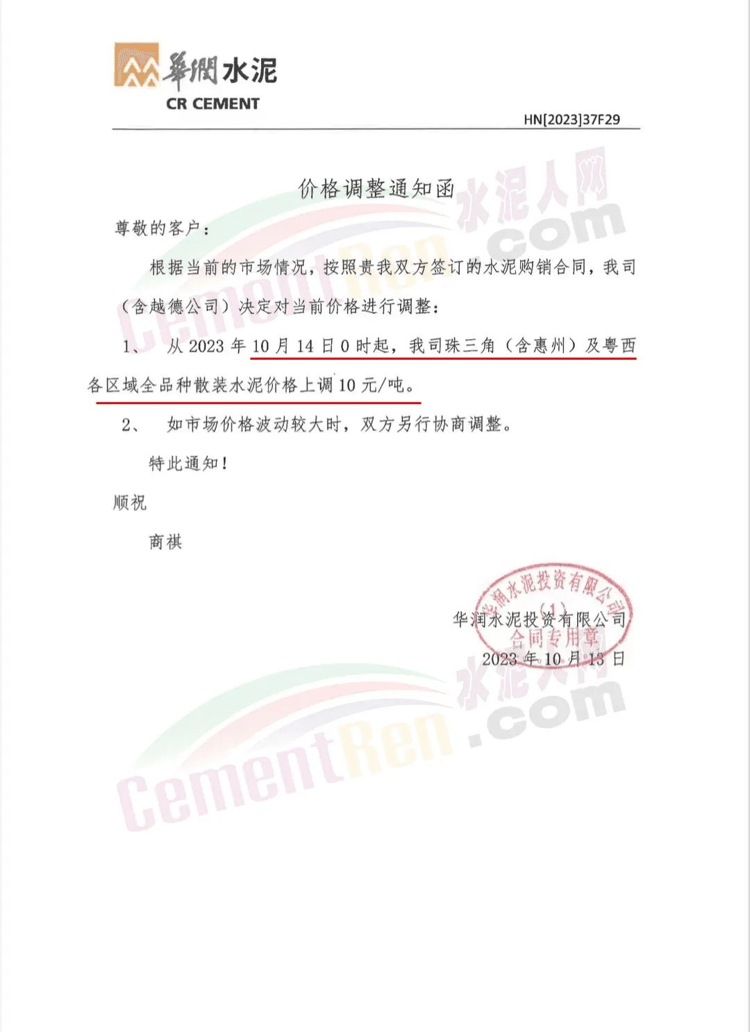 此前在各區(qū)域建立直銷機(jī)制,并報(bào)出市場(chǎng)較低價(jià)的華潤(rùn)水泥通知,自10月14日起,公司珠三角(含惠州)及粵西各區(qū)域全品種散裝水泥價(jià)格上調(diào)10元/噸。
