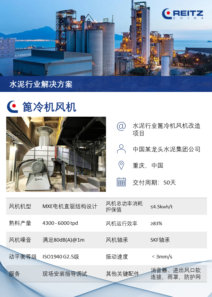 銳志風機憑借優(yōu)秀的技術設計和精湛的制造工藝,幫助該客戶(中國北方最大的水泥生產(chǎn)商和供應商)在篦冷機風機改造項目中,順利實現(xiàn):