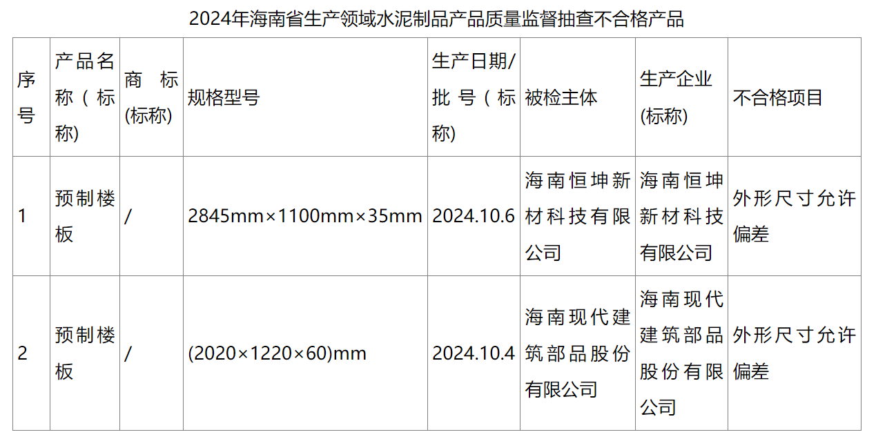 同期公布,2024年海南省生產領域水泥制品產品質量監督抽查結果顯示,共抽查了40批次產品,經檢驗,有2批次不符合標準要求,涉及的不合格項目為,外形尺寸允許偏差。