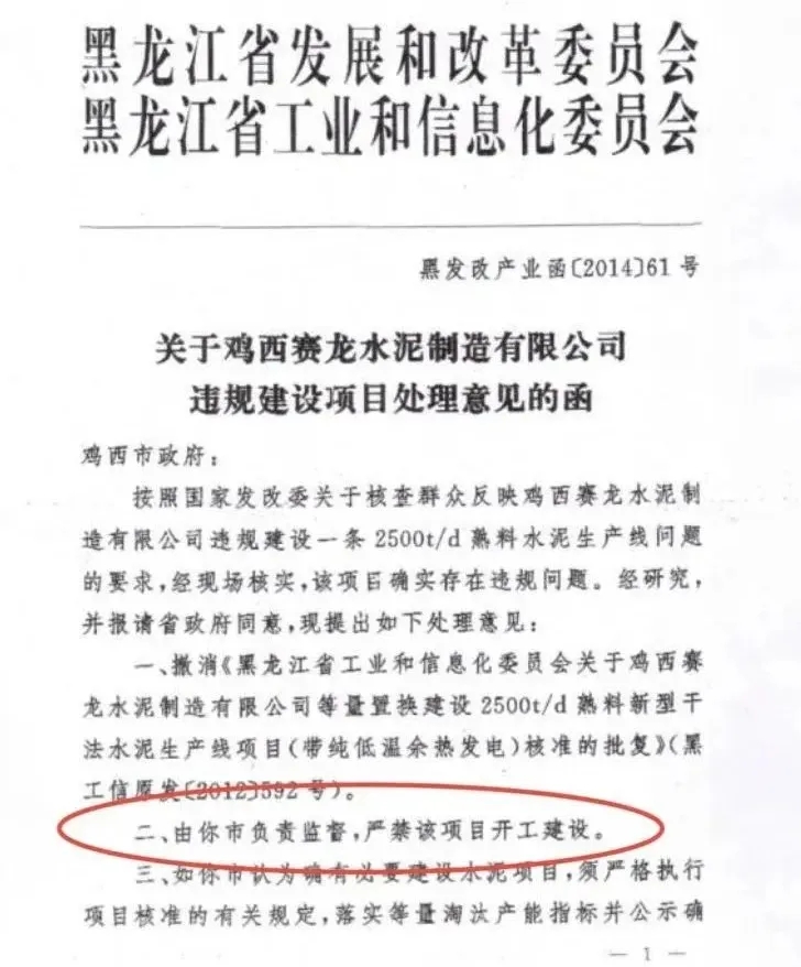 早在十年前,雞西賽龍水泥制造有限公司在建的日產(chǎn)2500噸水泥生產(chǎn)線,按照國(guó)發(fā)〔2013〕41號(hào)要求,嚴(yán)禁建設(shè)新增產(chǎn)能項(xiàng)目,分類(lèi)妥善處理在建違規(guī)項(xiàng)目,清理整頓建成違規(guī)產(chǎn)能相關(guān)要求,被黑龍江省發(fā)改委、黑龍江省工信廳撤銷(xiāo),并明確表示,嚴(yán)禁該項(xiàng)目開(kāi)工建設(shè)。