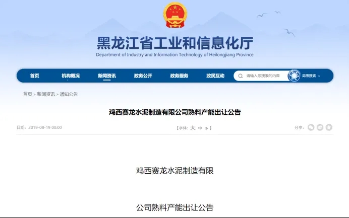 而在此之前,2019年8月19日,黑龍江省工業(yè)和信息化廳發(fā)布的《雞西賽龍水泥制造有限公司熟料產(chǎn)能出讓公告》顯示,雞西賽龍水泥制造有限公司出讓30萬(wàn)噸/年新型干法回轉(zhuǎn)窯2.8*40m2臺(tái)給雞西賽龍水泥制造有限公司建設(shè)2500t/d熟料新型干法水泥生產(chǎn)線項(xiàng)目。